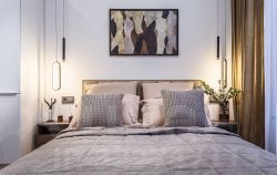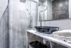 Двуспальная кровать с ортопедическим матросом и ящиком для хранения белья, телевизор с диагональю 50, подоконники - искусственный камень, столешница в ванной комнате, также- камень. Плитка- керамогранит ( Испания)