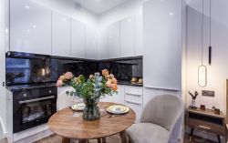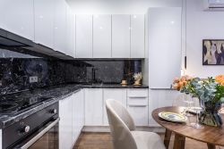 Большая функциональная кухня с множеством мест для хранения, встроенная техника ( посудомоечная машинка, холодильник, духовой шкаф с функцией гриль и св печь, варочная панель, вытяжка, стиральная машинка)