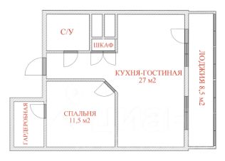 Планировка квартиры: гостиная совмещённая с кухней - 27 м2 и выходом на просторную лоджию с панорамным остеклением, спальня - 11,5 м2 с гардеробной комнатой, С/У совмещенный. Графическая часть представлена на последнем фото.