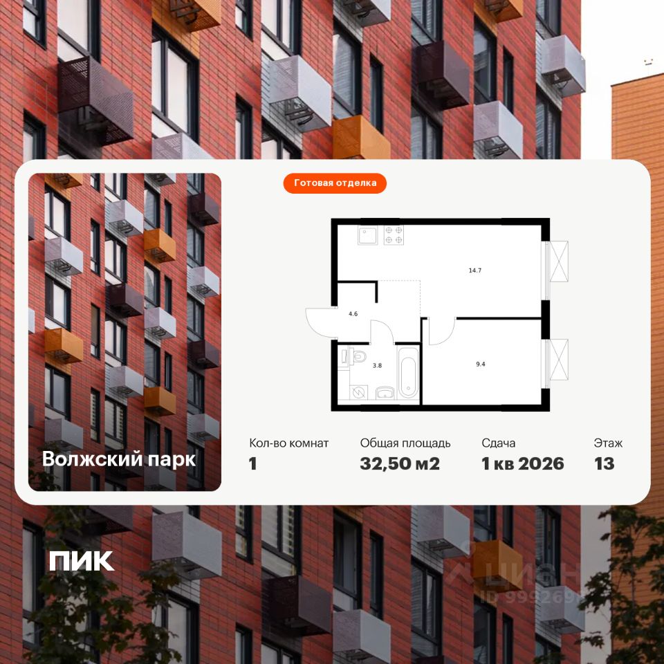 Продаётся 1-комн. квартира площадью 32,5 кв.м на 13 этаже 15 этажного дома (Корпус 6.1, Секция 2) проекта ПИК Волжский парк. Светлый просторный подъезд на уровне земли, функциональная планировка, большие окна, c отделкой.
