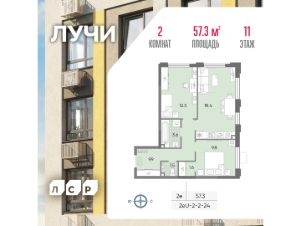 Продается 2-комнатная квартира общей площадью 57.3 кв. метров на 11 этаже жилого комплекса Лучи.