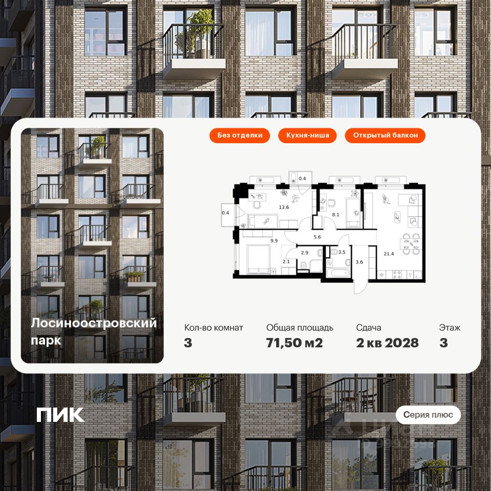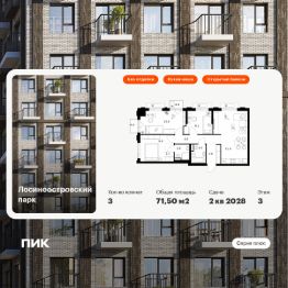 Продаётся 3-комн. квартира площадью 71,5 кв.м на 3 этаже 17 этажного дома (Корпус 2.3, Секция 2) проекта ПИК Лосиноостровский парк. Светлый просторный подъезд на уровне земли, функциональная планировка, большие окна, без отделки.