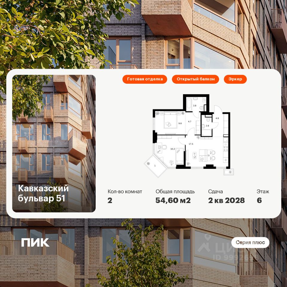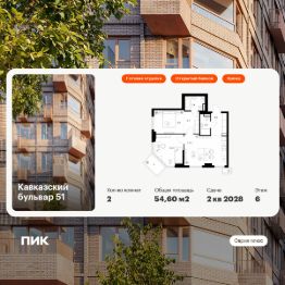 Продаётся 2-комн. квартира площадью 54,6 кв.м на 6 этаже 23 этажного дома (Корпус 3.2, Секция 2) проекта ПИК Кавказский бульвар 51. Светлый просторный подъезд на уровне земли, функциональная планировка, большие окна, c отделкой.