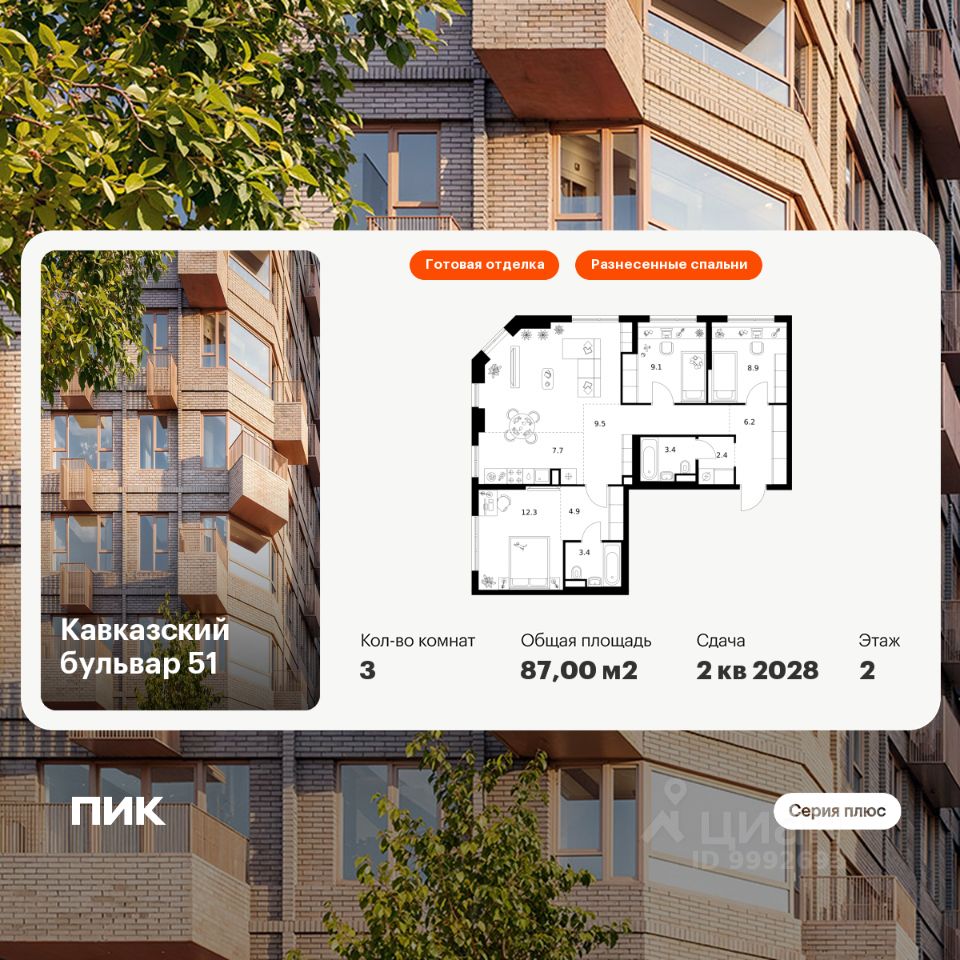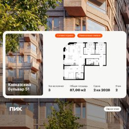 Продаётся 3-комн. квартира площадью 87 кв.м на 2 этаже 23 этажного дома (Корпус 3.3, Секция 3) проекта ПИК Кавказский бульвар 51. Светлый просторный подъезд на уровне земли, функциональная планировка, большие окна, c отделкой.