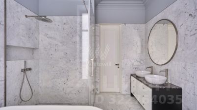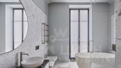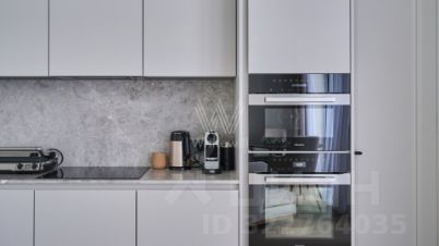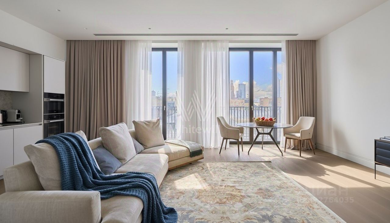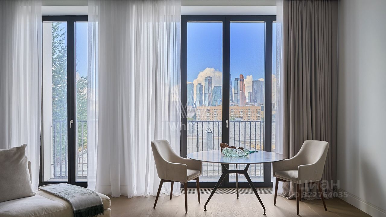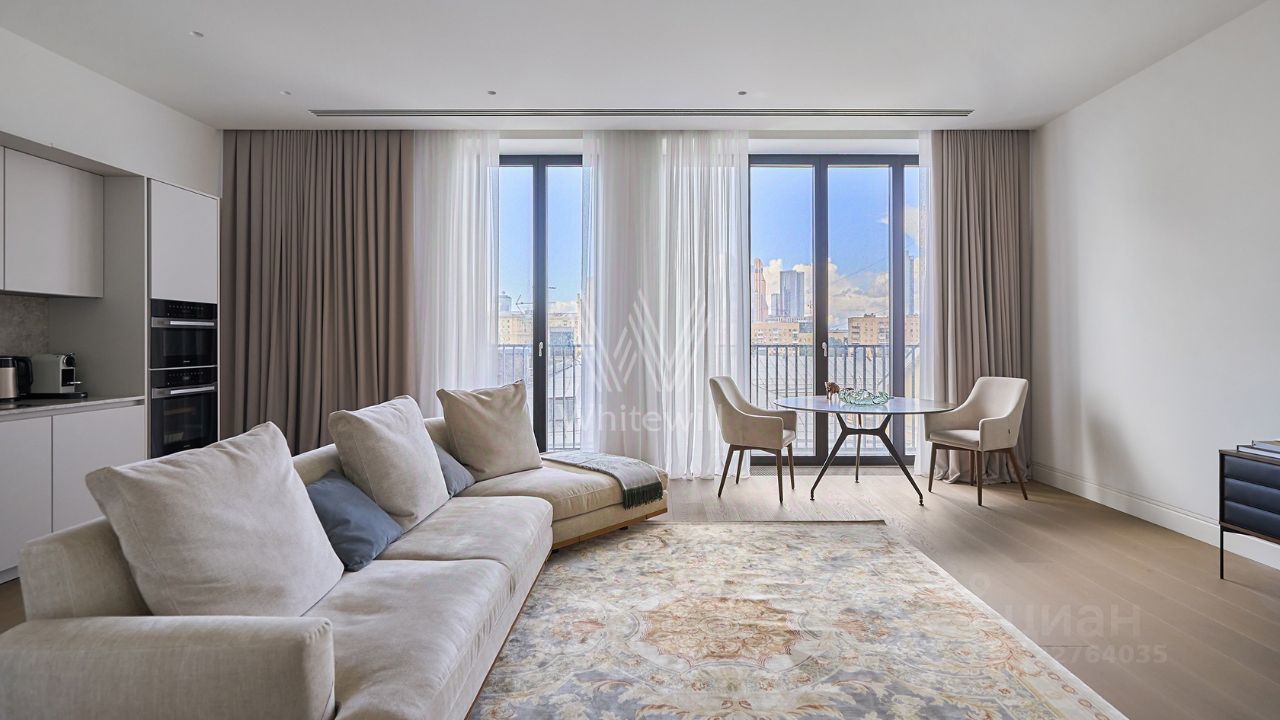 Квартира общей площадью 139 м² расположена на третьем этаже. Предлагается к продаже с отделкой под ключ. Интерьер оформлен в лаконичных светлых тонах.