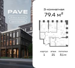 Продается 3-к. квартира квартира номер 195 общей площадью 79.4 кв.м. на 21-м этаже 33 этажного дома, 1. Без отделки.