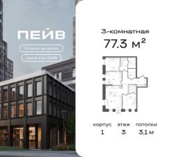 Продается трехкомнатная квартира 12 общей площадью 77.3 кв. м на 3-м этаже 33-этажного дома, корпус 1. Без отделки.