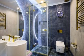 Гостевой санузел оборудован душевой и зоной для стирки. Необычная фактура плитки и подсветка зеркала создают эффект глубины, подчеркивая красоту пространства.