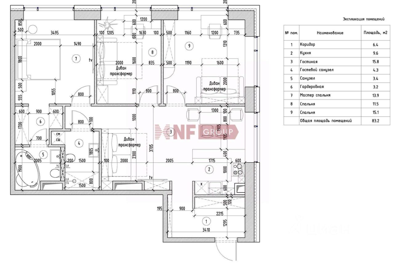 Оптимальный вариант организации пространства: гостиная-столовая с зоной кухни, мастер-спальня с ванной и гардеробной, две детские спальни, полноценный санузел.