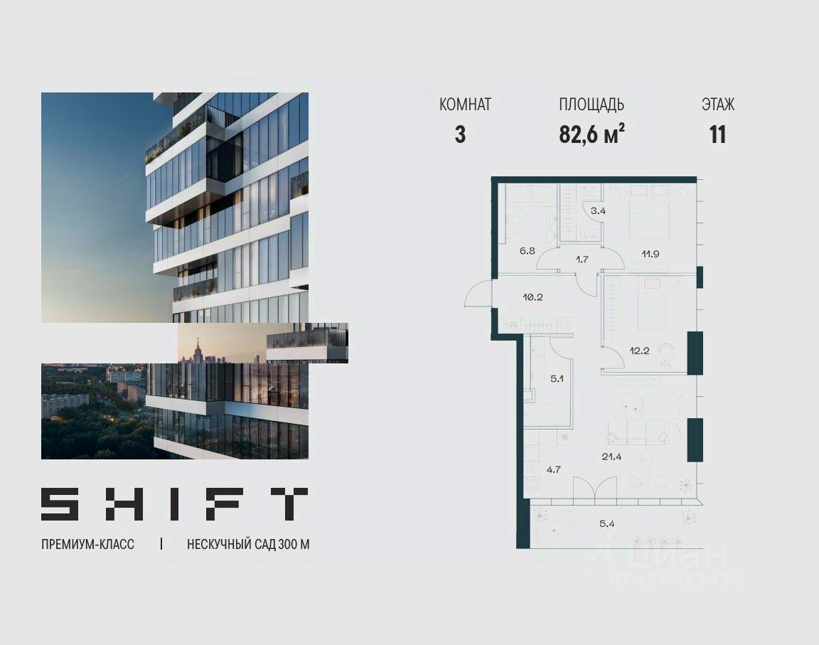 3-к квартира в премиальном комплексе SHIFT на 11-м этаже в 18 этажном здании. Общая площадь 82.6 кв. м.