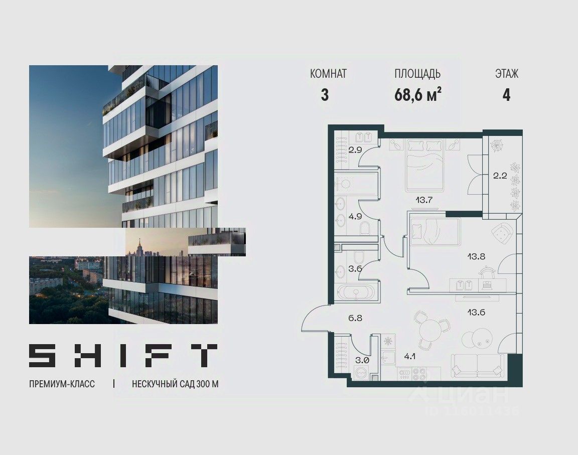 3-к квартира в премиальном комплексе SHIFT на 4-м этаже в 18 этажном здании. Общая площадь 68.6 кв. м.