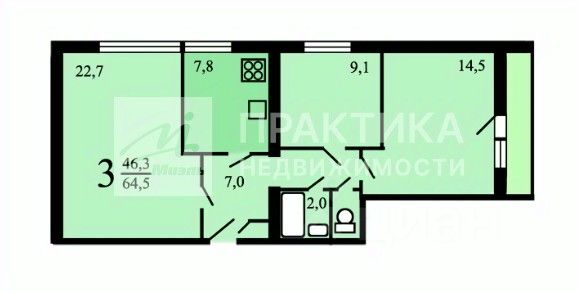 Квартира с изолированными комнатами, общая площадь распределена следующим образом: жилая площадь — 46,3 кв. м, кухня — 7,8 кв. м, площади комнат — 22,7 кв. м, 14,5 кв. м и 9,1 кв. м. Высота потолков составляет 2,55 м, что создаёт дополнительное ощущение простора.