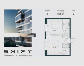 1-к квартира в премиальном комплексе SHIFT на 2-м этаже в 18 этажном здании. Общая площадь 51.8 кв. м.