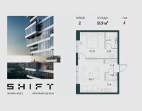 1-к квартира в премиальном комплексе SHIFT на 4-м этаже в 18 этажном здании. Общая площадь 51.9 кв. м.