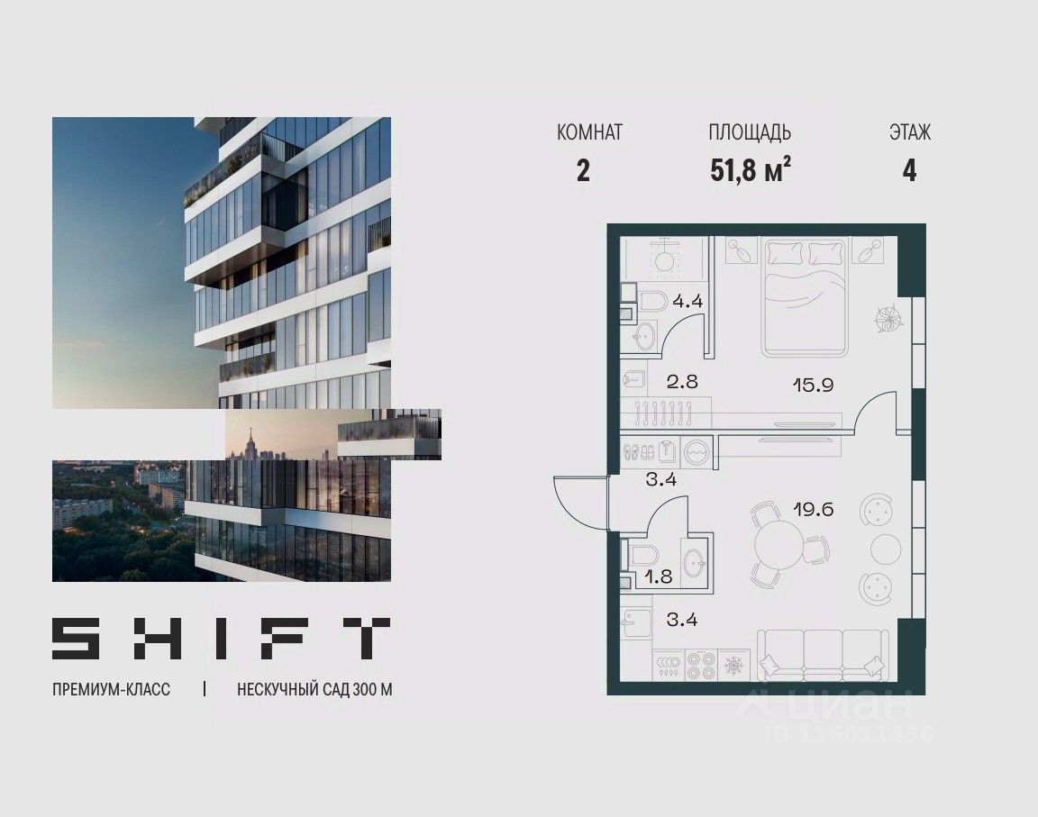 1-к квартира в премиальном комплексе SHIFT на 4-м этаже в 18 этажном здании. Общая площадь 51.8 кв. м.