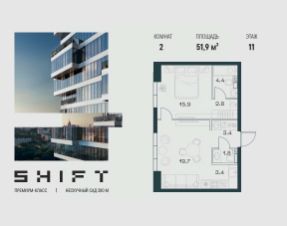 1-к квартира в премиальном комплексе SHIFT на 11-м этаже в 18 этажном здании. Общая площадь 51.9 кв. м.