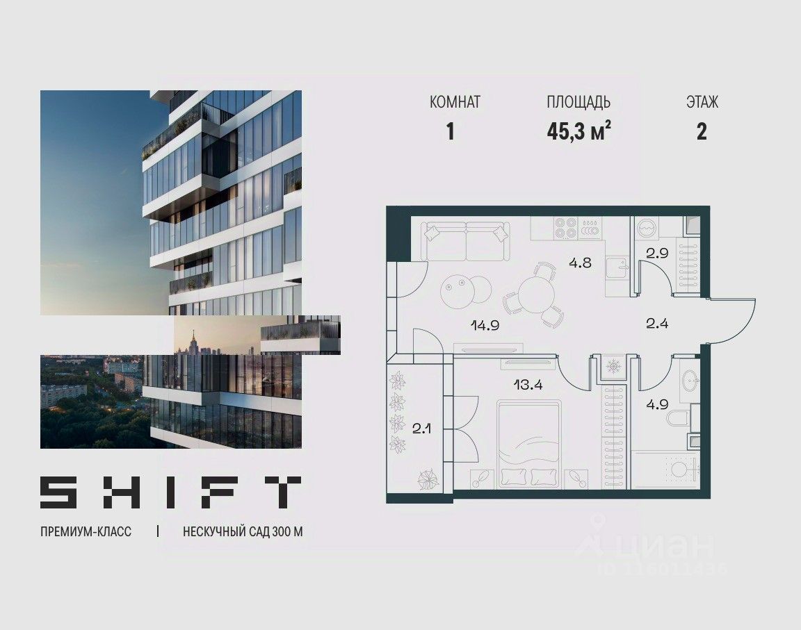 2-к квартира в премиальном комплексе SHIFT на 2-м этаже в 18 этажном здании. Общая площадь 45.3 кв. м.