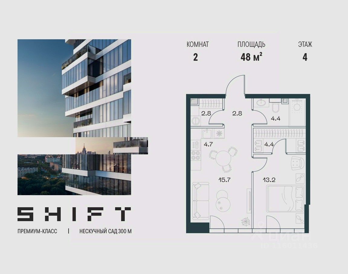 1-к квартира в премиальном комплексе SHIFT на 4-м этаже в 18 этажном здании. Общая площадь 48 кв. м.
