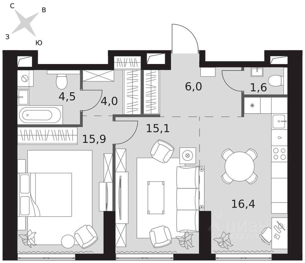 - Мастер-зона с санузлом и гардеробной. Всё для вашего комфорта и удобства, включая личный санузел и гардероб.