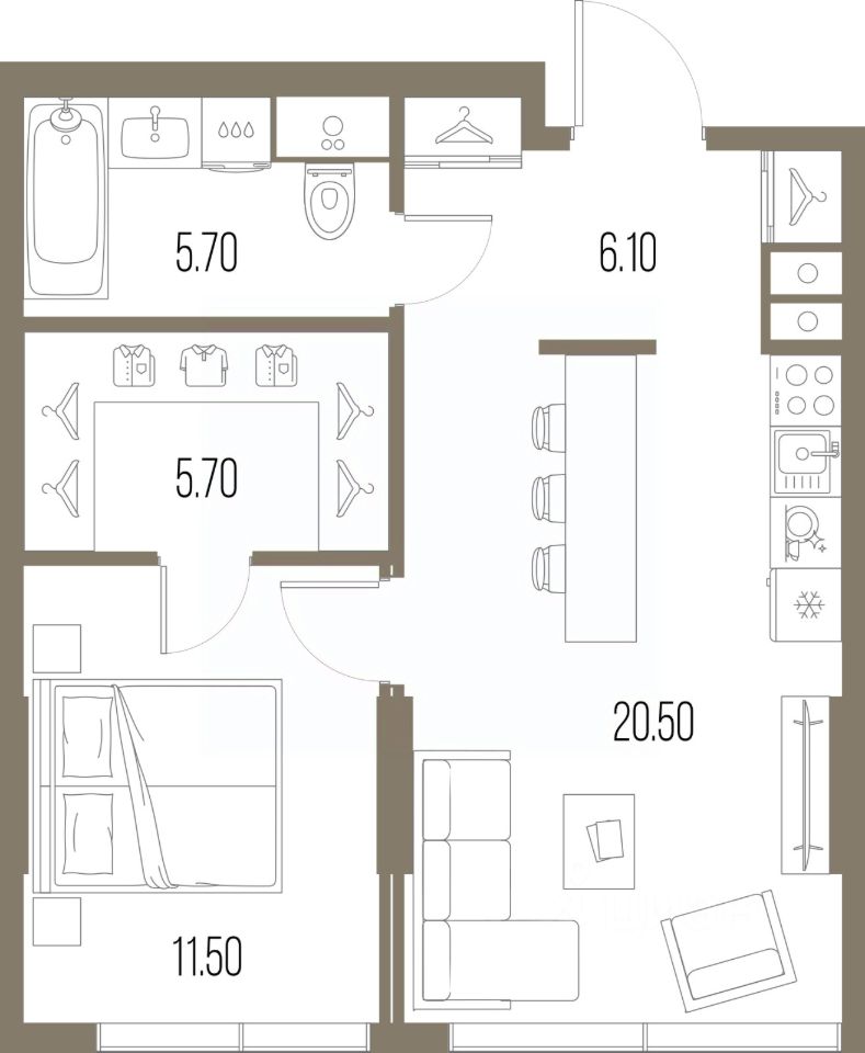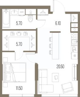 Однокомнатная квартира с предчистовой отделкой в ЖК "Северный Порт" на 19 этаже. Общая площадь: 49.5 кв.м., жилая: 11.5 кв.м., площадь просторной кухни-столовой: 20.5 кв.м. Все окна выходят на одну сторону. В квартире один совмещенный санузел. Высота потолков 3.15 м.