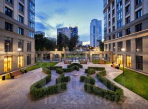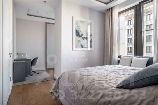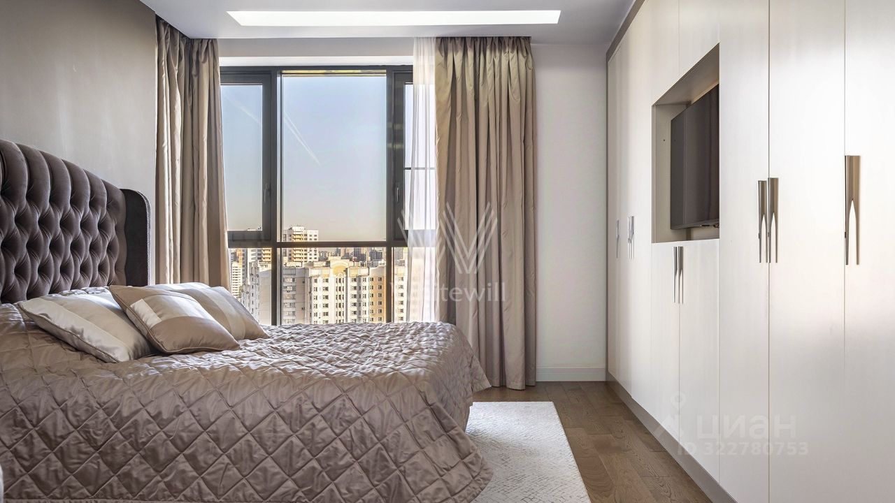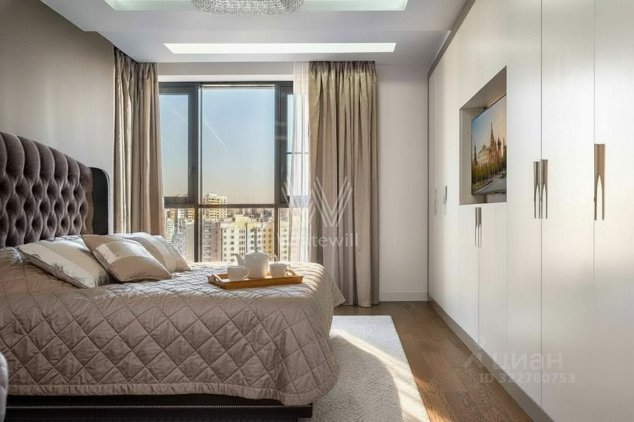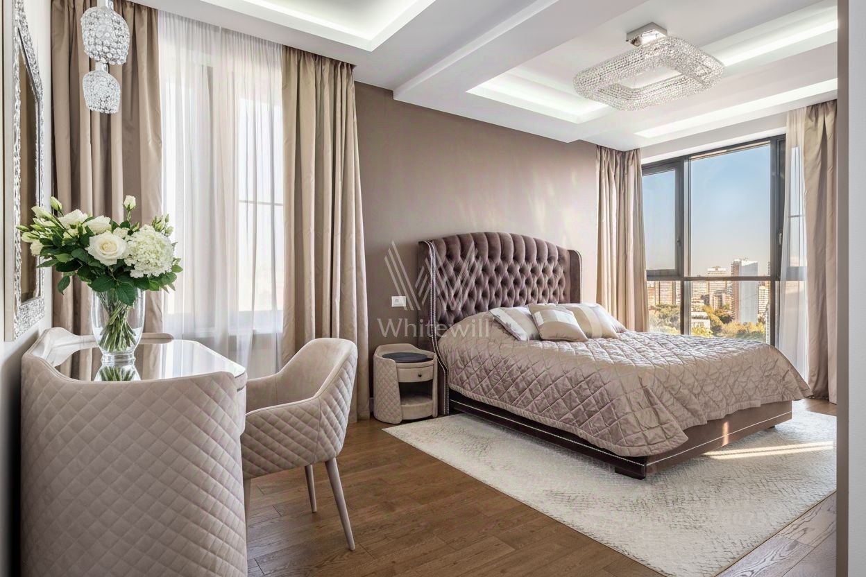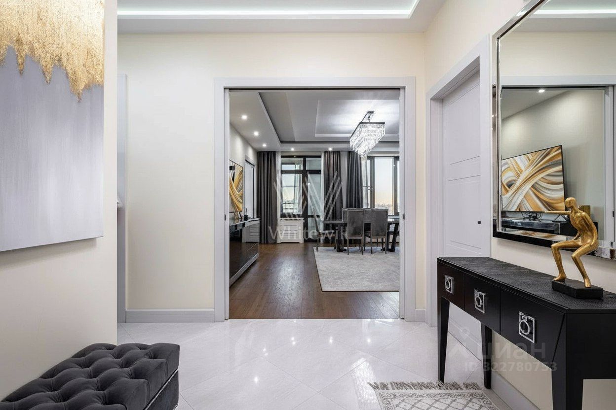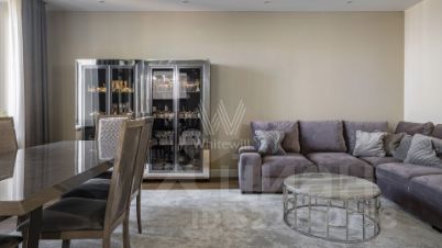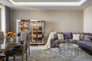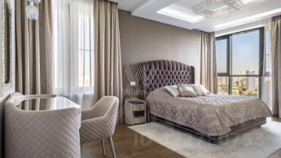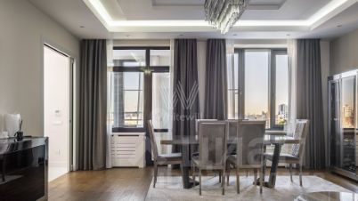 Квартира полностью меблирована и укомплектована бытовой техникой. Функциональная планировка включает гостиную с обеденной зоной, изолированную кухню, три спальни, четыре санузла, гардеробные, три балкон и холл. Окна ориентированы на две стороны света, открываются виды на город.