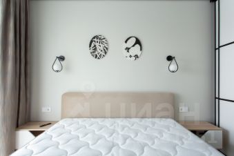 Двуспальная кровать Аскона с ортопедическим матрасом, гардеробная система Larvij в спальне. Кухня Зов со встроенной техникой Gorenie