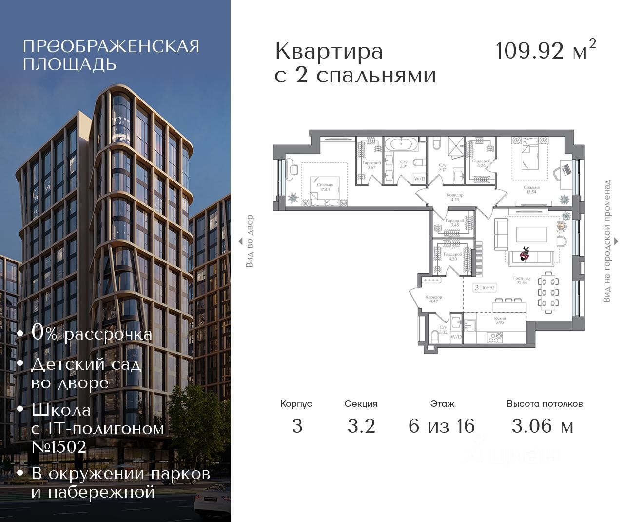 Квартира на 6 этаже в жилом комплексе премиум-класса "Преображенская площадь". Общая площадь: 109.92 кв.м.