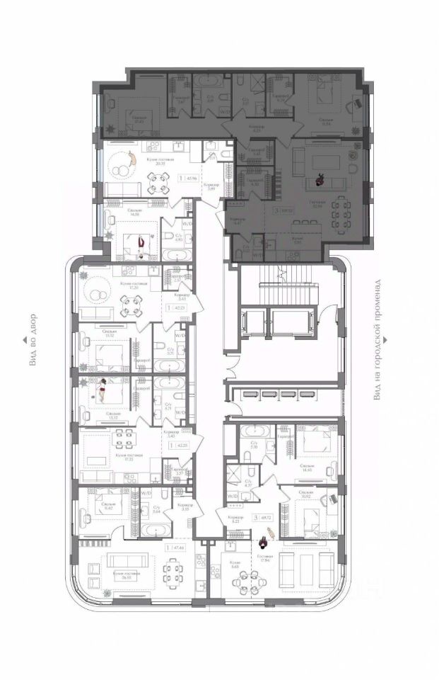 Внутренний двор 1,5 га функциональное и безопасное пространство для игр, работы и занятий спортом. Пешеходный променад для прогулок. Дома переменной этажности. Есть подземный паркинг.