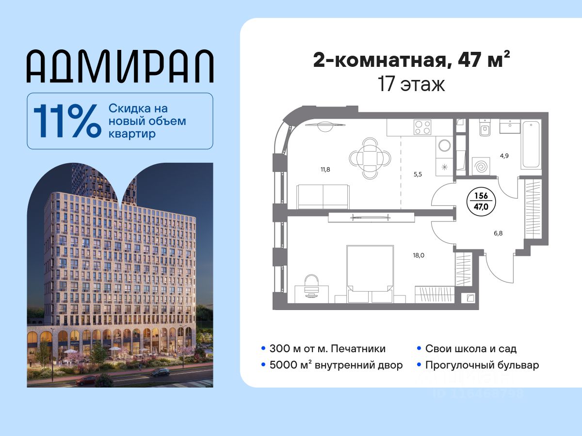 Архитектура корпусов отличается динамичностью облика благодаря переменной этажности: высокие башни сочетаются с домами средней этажности. Изящным украшением становятся арочные витражи. Интеллигентный и современный стиль "Адмирала" продолжается в гранд-лобби: пастельные оттенки интерьера и фактурные элементы декора создают атмосферу безмятежного отдыха, особое ощущение простора дарят высокие потолки до 4 м и витражные окна. В домах предусмотрено от трех до шести скоростных лифтов, каждый из них спускается на любой этаж подземного паркинга и обладает удобными сенсорными панелями управления и низким уровнем шума.