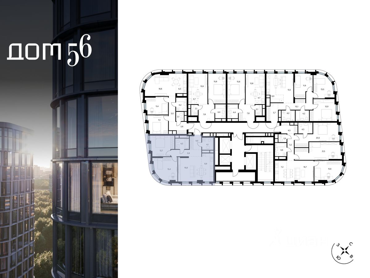 Архитектурный стиль "Дома 56" - параметрический минимализм. Футуристические фасады квартала с "эффектом закручивания" словно вращаются вокруг своей оси. Динамичный образ башен дополняет эффектное остекление - окна в пол будут в каждой квартире.