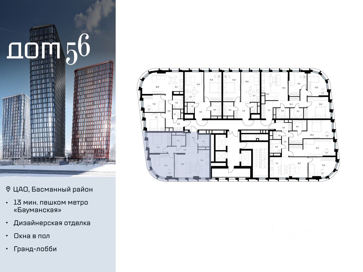 "Дом 56" - расположен в Басманном районе на ул. Фридриха Энгельса, всего в 12-15 минутах пешком от станций метро "Бауманская" и "Электрозаводская".