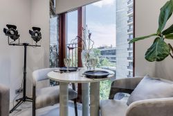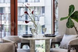 В апартаментах выполнен дизайнерский ремонт с использованием премиальных материалов. Просторная студия грамотно зонирована, поэтому здесь будет комфортно как для отдыха, так и для приема гостей. Санузел совмещенный и оснащен всей необходимой сантехникой. Окна выходят во двор, поэтому в квартире будет тихо и уютно.