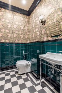 Паркет и двери - инженерная доска из дуба, паркет выложен классическими квадратами - авторский проект. Натуральный мрамор, плитка орнамент ручной работы - метлах, английские обои. На стенах в изголовье кровати выполнено панно из натурального дуба - раскладка французской елки.