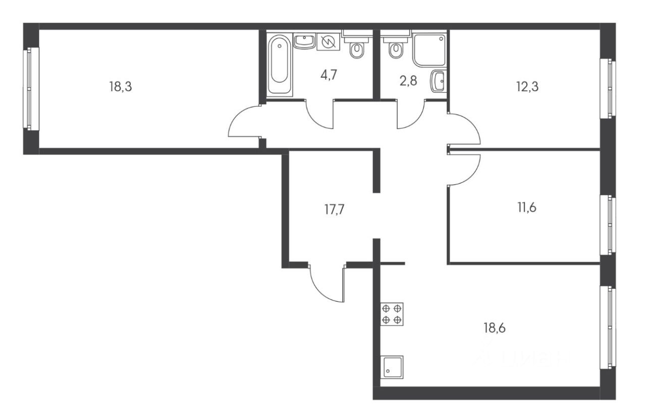Продается просторная трехкомнатная квартира с евроремонтом в современном доме 2020 года постройки. Общая площадь квартиры — 84.9 кв. м, жилая — 50 кв. м, а кухня — 18,6 кв. м. Квартира расположена на 17 этаже 17-этажного панельного дома. Высота потолков — 2.65 метра. Окна выходят как во двор, так и на улицу, что обеспечивает хорошую освещенность и разнообразие видов.