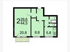 Квартира имеет отличную планировку общей площадью 44.3 кв. м. Кухня 5.8 кв.м, комнаты 20.8 кв.м. и 8.8 кв.м. Санузел раздельный. Из большой комнаты выход на балкон. Квартира требует ремонта.