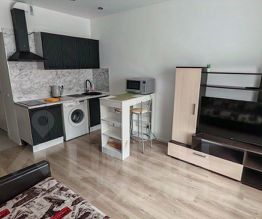 В студии сделан современный ремонт, есть вся необходимая для комфортной жизни мебель и техника (холодильник, стиральная машина, электрическая плита, микроволновая печь, чайник, телевизор).