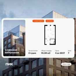 Продаётся квартира-студия площадью 19,8 кв.м на 7 этаже 16 этажного дома (Корпус 2.6/1.1, Секция 1) проекта ПИК Бунинская набережная. Светлый просторный подъезд на уровне земли, функциональная планировка, большие окна, c отделкой.