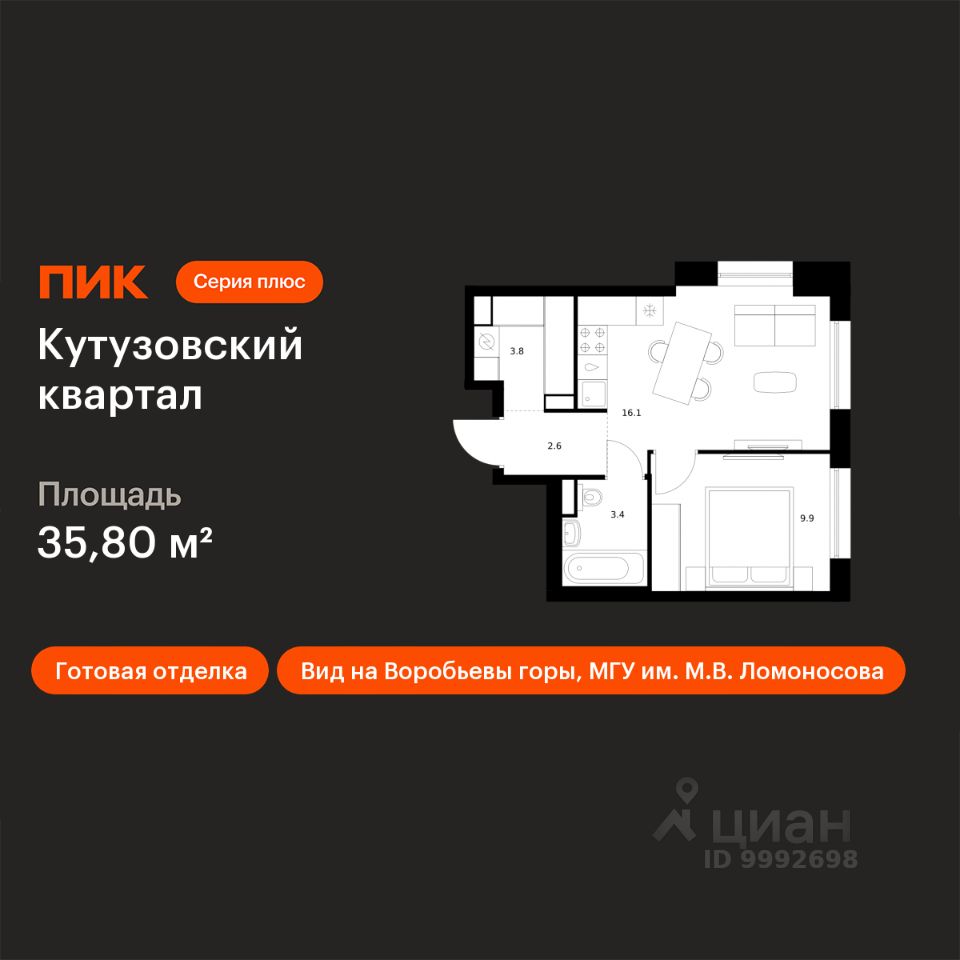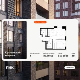 Продаётся 1-комн. квартира площадью 35,8 кв.м на 30 этаже 30 этажного дома (Корпус 3, Секция 2) проекта ПИК Кутузовский квартал. Светлый просторный подъезд на уровне земли, функциональная планировка, большие окна, c отделкой.