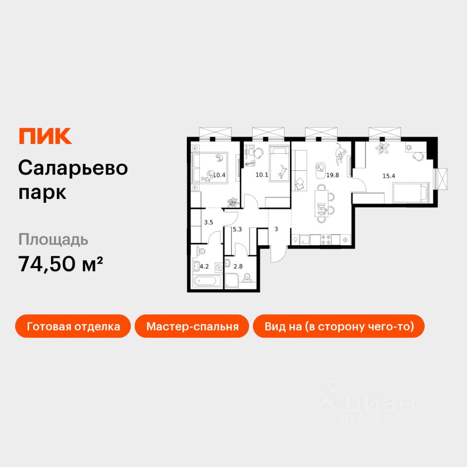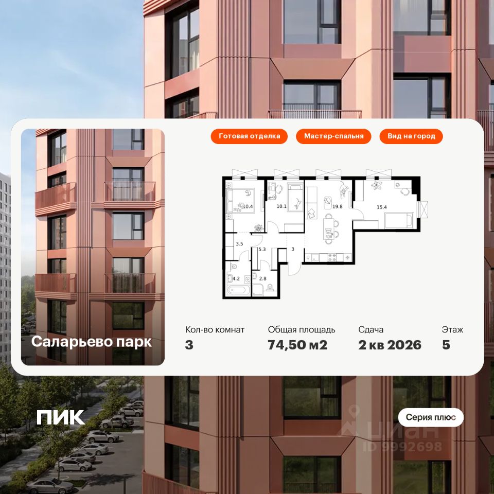 Продаётся 3-комн. квартира площадью 74,5 кв.м на 5 этаже 17 этажного дома (Корпус 20, Секция 1) проекта ПИК Саларьево парк. Светлый просторный подъезд на уровне земли, функциональная планировка, большие окна, c отделкой.