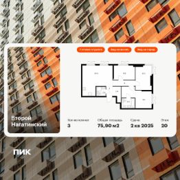 Продаётся 3-комн. квартира площадью 75,9 кв.м на 20 этаже 33 этажного дома (Корпус 1.1, Секция 1) проекта ПИК Второй Нагатинский. Светлый просторный подъезд на уровне земли, функциональная планировка, большие окна, c отделкой.