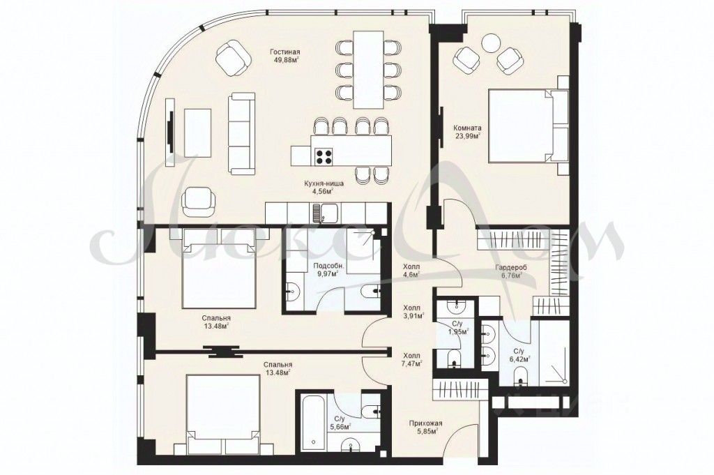 Планировка: кухня-гостиная, 3 мастер спальни с гардеробной и с\у, гостевой с\у.