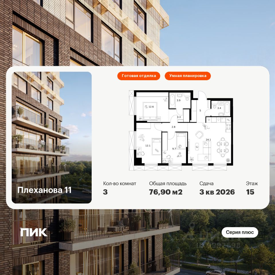 Продаётся 3-комн. квартира площадью 76,9 кв.м на 15 этаже 24 этажного дома (Корпус 1.4, Секция 4) проекта ПИК Плеханова 11. Светлый просторный подъезд на уровне земли, функциональная планировка, большие окна, c отделкой.
