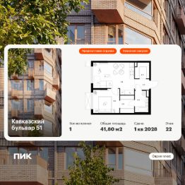 Продаётся 1-комн. квартира площадью 41,8 кв.м на 22 этаже 24 этажного дома (Корпус 3.5, Секция 2) проекта ПИК Кавказский бульвар 51. Светлый просторный подъезд на уровне земли, функциональная планировка, большие окна, предчистовая отделка.