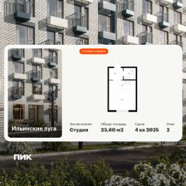 Продаётся квартира-студия площадью 23,6 кв.м на 2 этаже 9 этажного дома (Корпус 2.13, Секция 1) проекта ПИК Ильинские луга. Светлый просторный подъезд на уровне земли, функциональная планировка, большие окна, c отделкой.