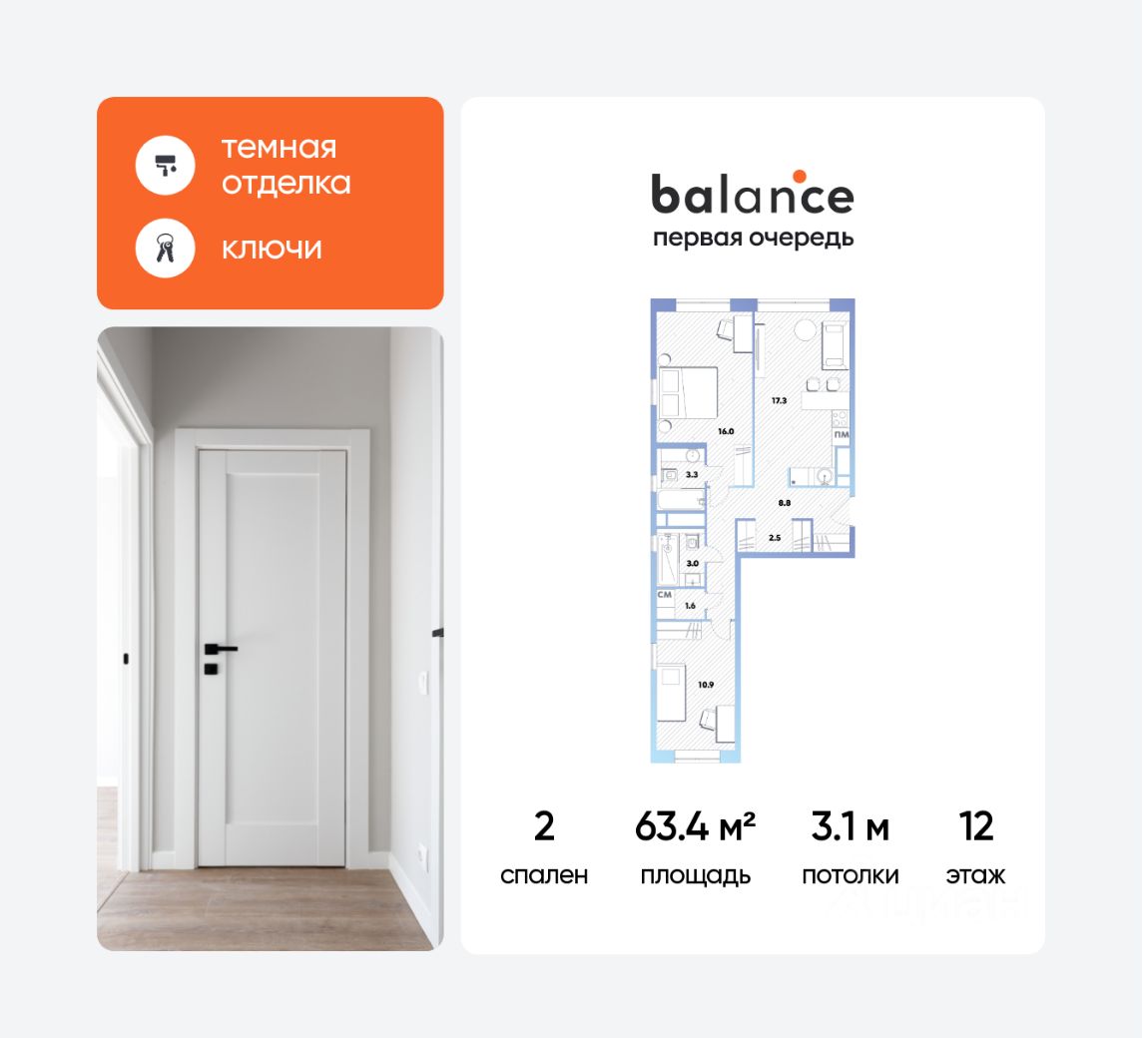 продаётся готовая 2-комнатная квартира с увеличенной высотой потолка (3,1 м) на 12 этаже в жк balance