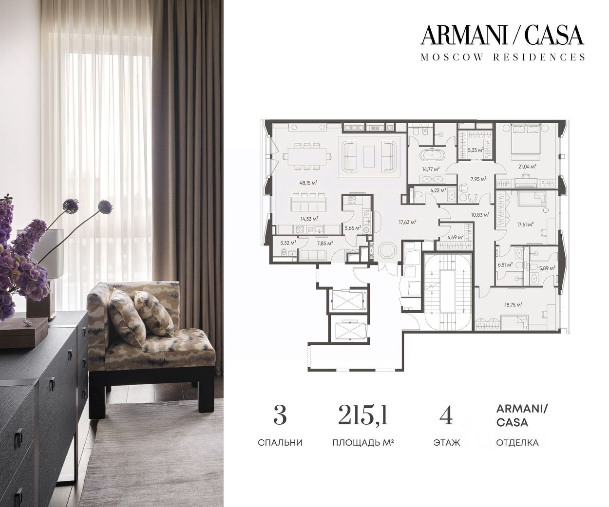 Armani / Casa Moscow Residences — первый и единственный в России проект, созданный в партнерстве с легендарным итальянским домом Armani. Это не просто жилье, а произведение искусства, где каждая деталь отражает безупречный вкус и изысканность итальянского стиля.