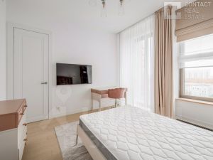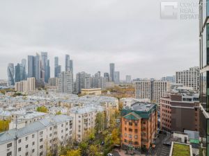 Квартира находится на 11 этаже — из панорамных окон открываются непревзойденные виды на три стороны света: на Москва-Сити, Нижний город Лаки. Благодаря высоким потолкам , французским балконам пространство наполнено приятным солнечным светом.