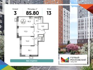 Общая площадь квартиры - 85,8 кв. м, этаж 13 из 19.