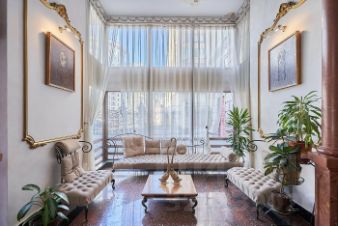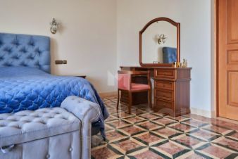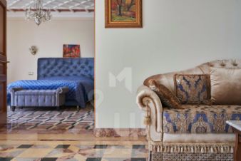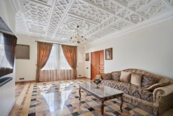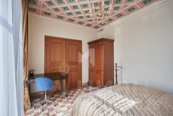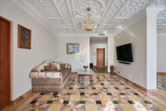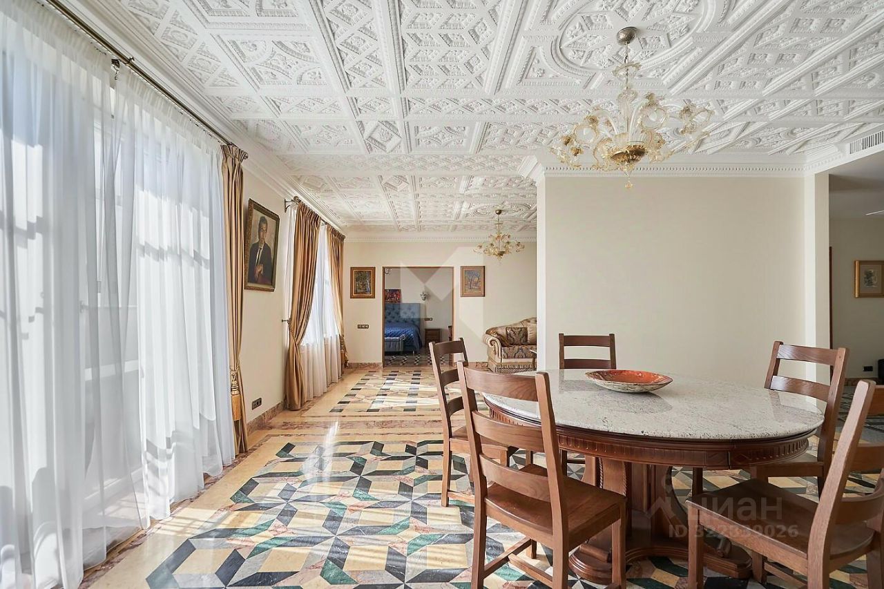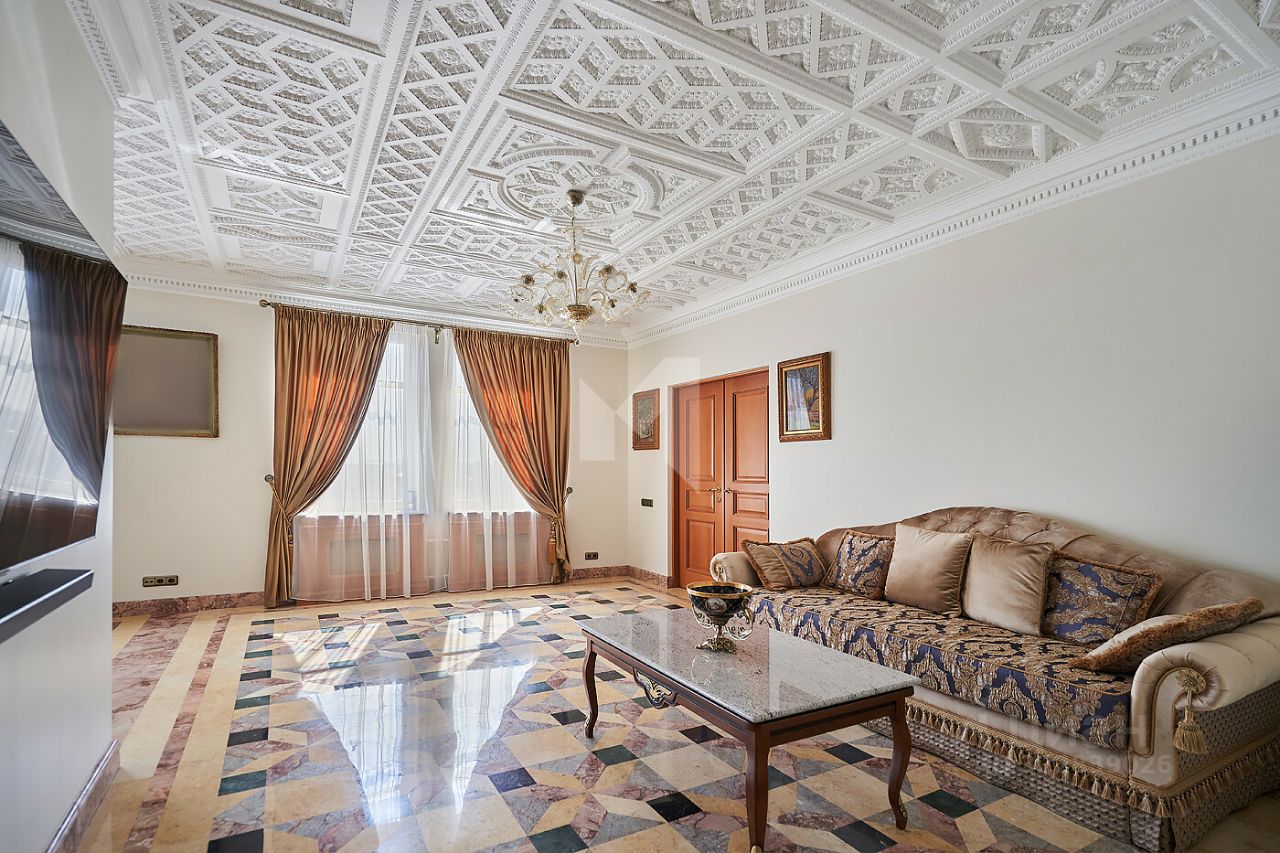 Квартира имеет функциональную планировку: просторная кухня с кладовкой, спальня, хозяйская спальня (мастер-блок с гардеробом и собственным санузлом), гостиная, столовая, гостевой санузел и гардеробная. Отделка выполнена с использованием высококачественных натуральных материалов: мраморные полы, мозаичные плитки в санузлах, шикарная гипсовая лепнина, фрески на потолке и стенах. Ремонт выполнен профессионалами, работавшими над "Храмом Христа Спасителя". Квартира полностью меблирована и оснащена современной бытовой техникой.
