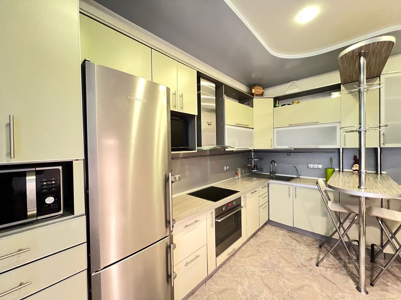 Планировка включает в себя: кухню-гостиную, оборудованную встроенной бытовой техникой, три спальни, просторный коридор и две застекленные лоджии, имеется кладовая комната. Окна выходят на две стороны.